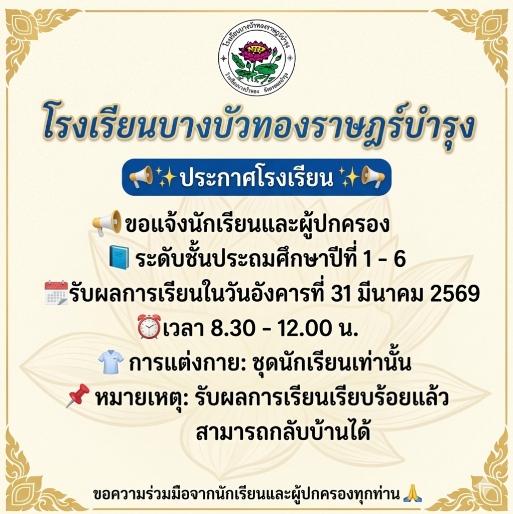 ประกาศประชาสัมพันธ์โรงเรียนบางบัวทองราษฎร์บำรุง รับการประเมิน ประกันคุณภาพภายนอก (Virtual Visit)